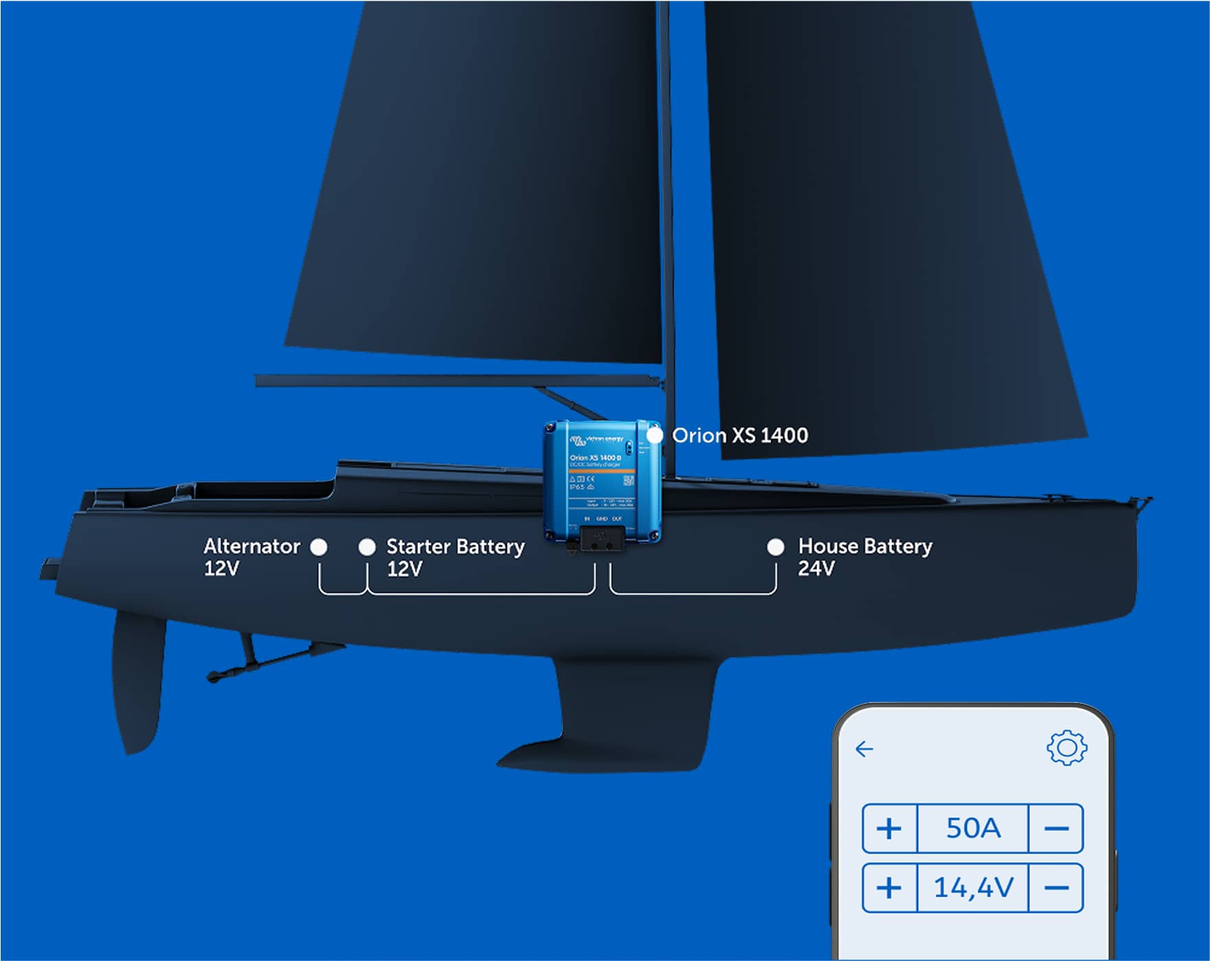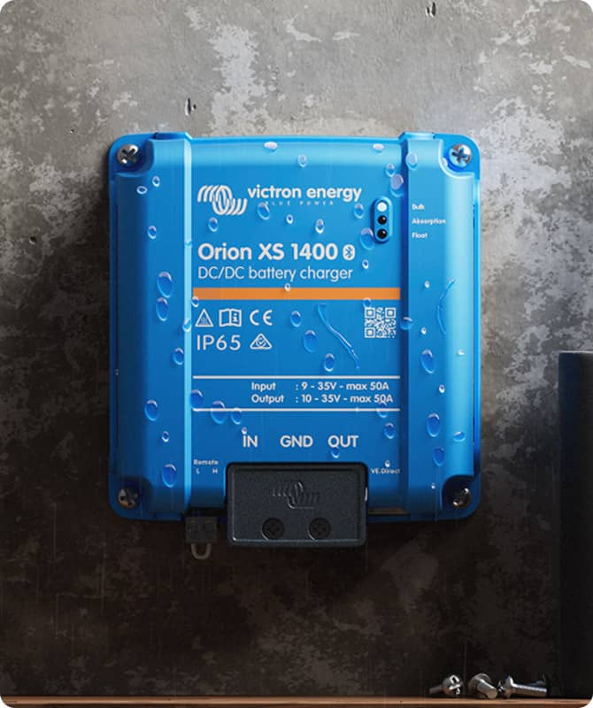 Міцний, компактний і безвентиляторний Orion XS створений для життя на борту. Він забезпечує ефективну зарядку DC-DC у тісних машинних відділеннях, підтримує кілька акумуляторних батарей і пропонує перетворення 12/24 В за допомогою моделі XS 1400.